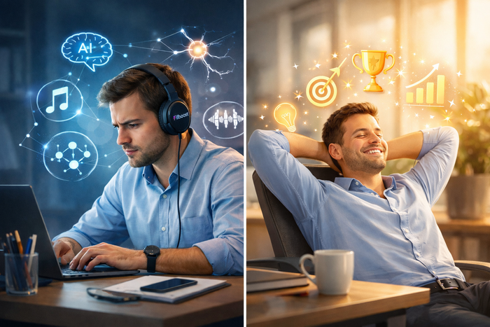 Quand la musique soutien le cerveau au travail. Nous transformons la difficulté de se mettre au travail en flow bénéfique et agréable. Pour que les journées de travail apportent efficacité personnelle et sérénité.